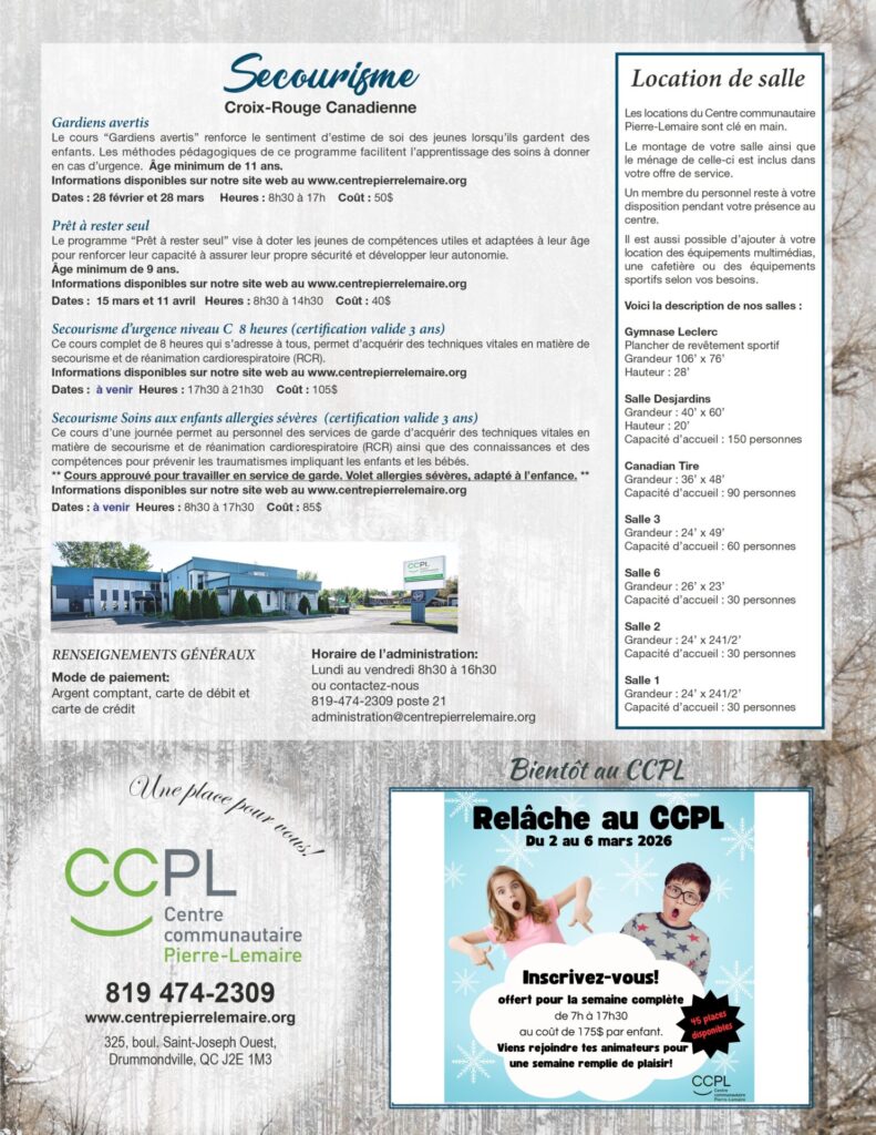 PROGRAMMATION HIVER 2026 Pour vous inscrire à partir du 9 décembre 9h, cliquez sur le lien ci-dessous! Qidigo — Centre communautaire Pierre-Lemaire — Activités à la session 21 décembre 2023 | Uncategorized |